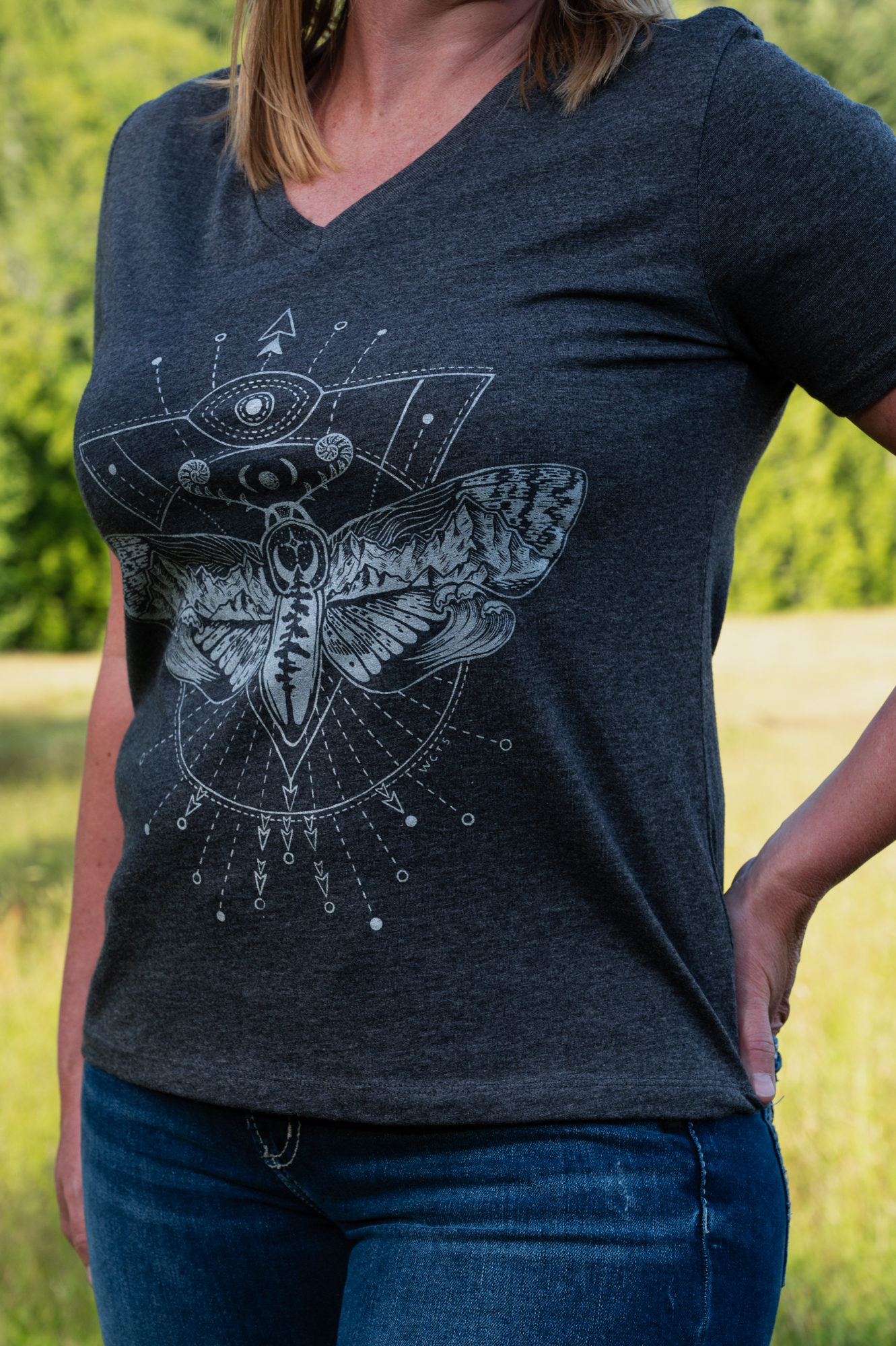 Let the stars be your guide! Celestial Moth is printed on a Poly-Cotton (50% Polyester / 50% Combed-Cotton) T-shirt.